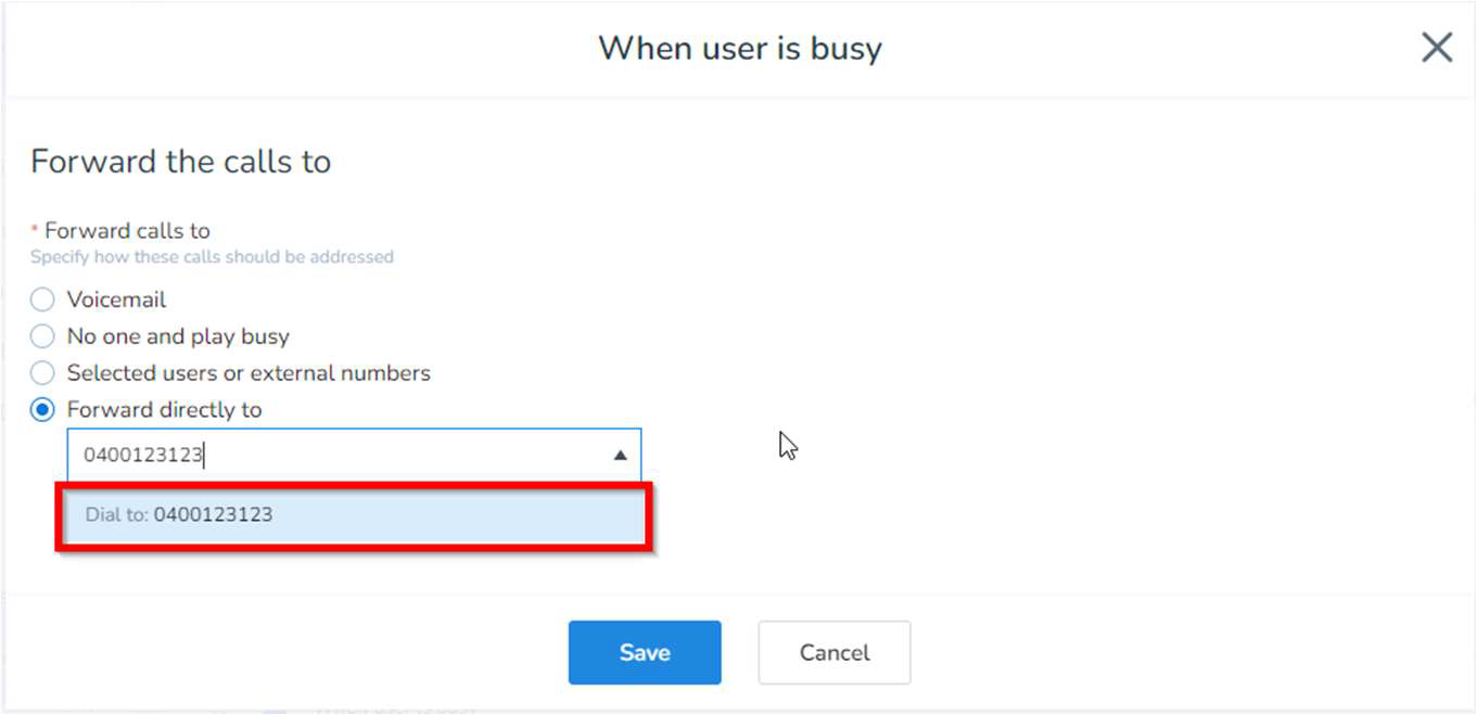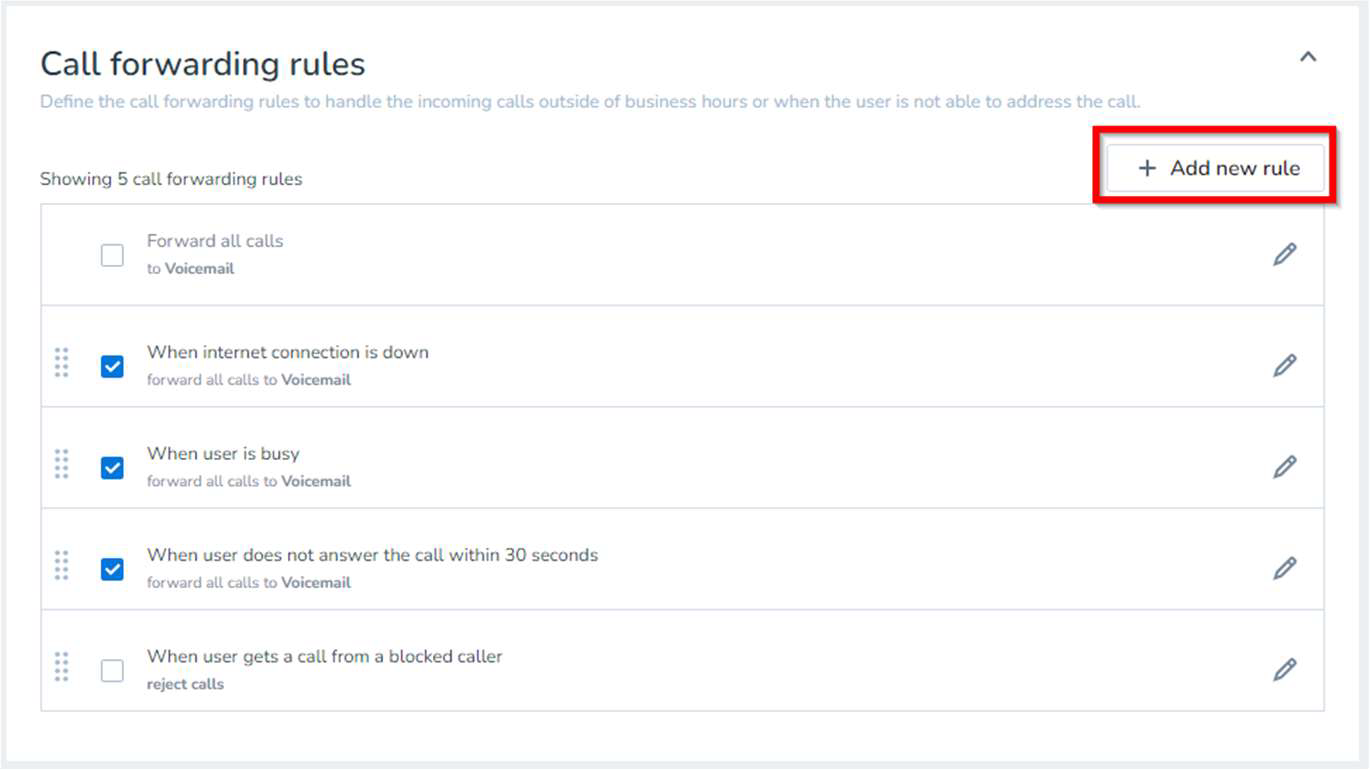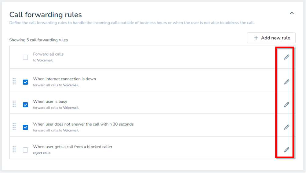 Click the pencil to edit a forwarding rule and you can set where the call will be directed to in that