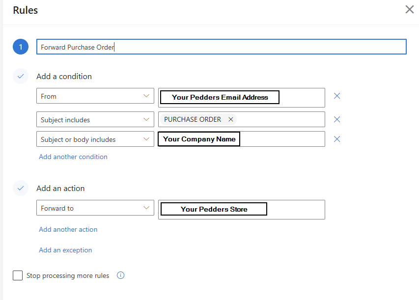 The following email rules can be created to forward emails to your store, if they are being received to your personal Pedders email address: