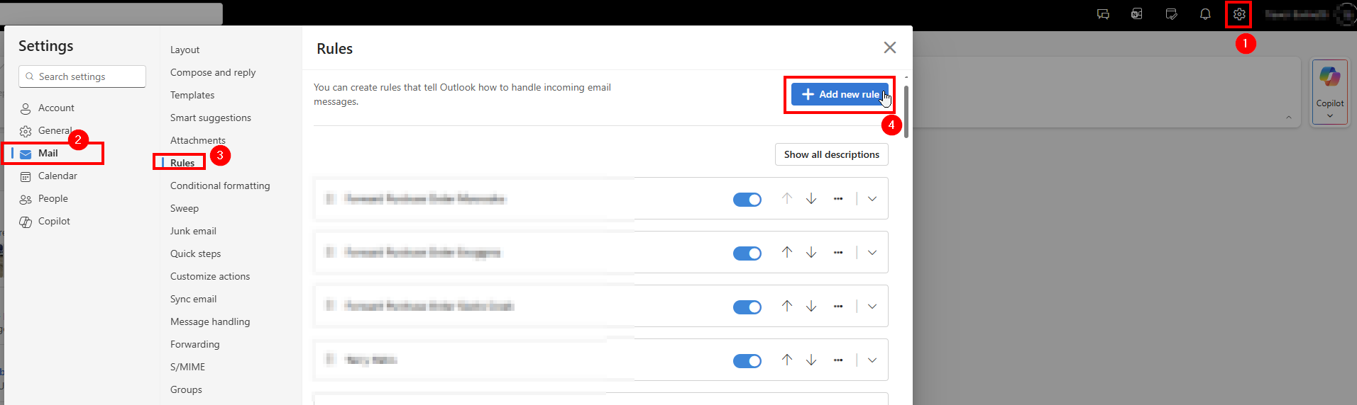 2. Open the settings menu by clicking the cog wheel -> Mail -> Rules -> Add New Rule