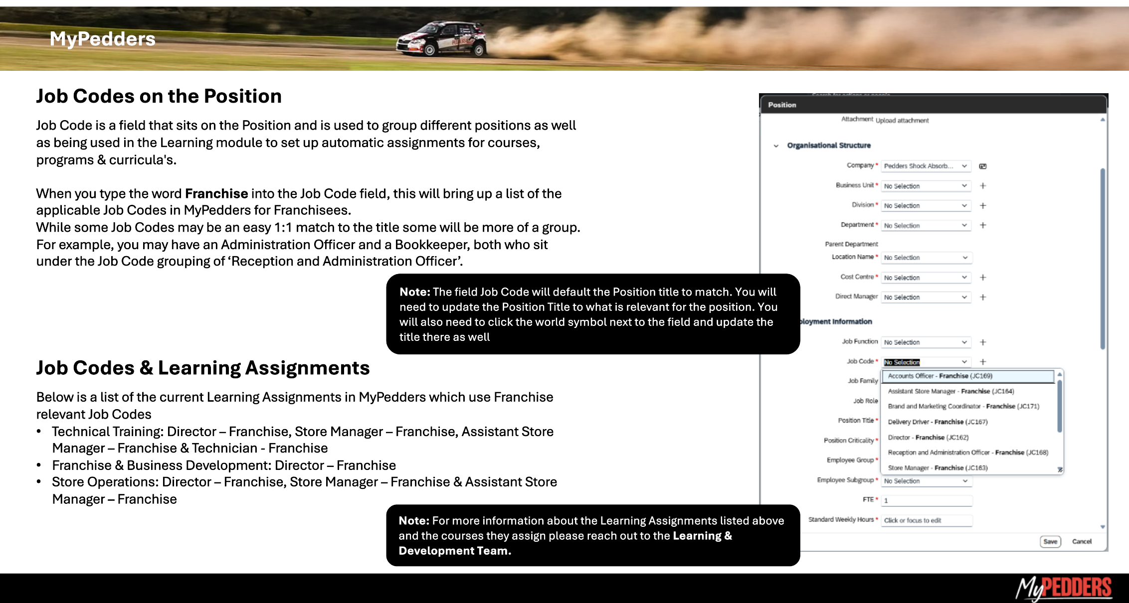 MyPedders Job Code Information for Franchises