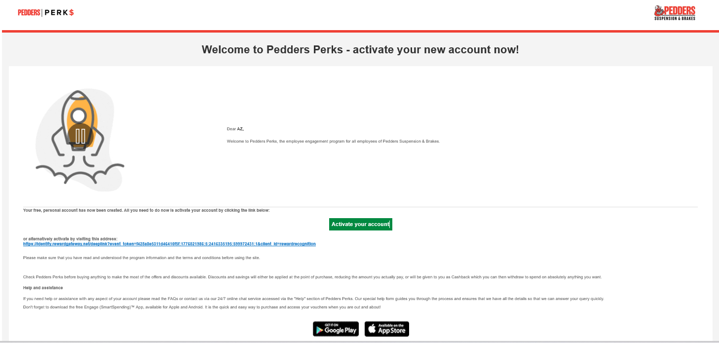 - Check your Pedders email to locate the Pedders Perks Activation email. Subject line: Welcome to Pedders Perks – activate your account.